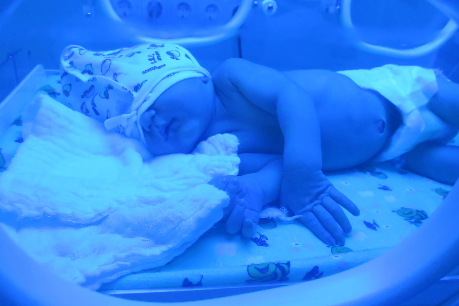 Phototherapy – Expose maximum areas of the infant’s skin to light (except eyes), which helps expedite removing excess bilirubin. This is because light absorbed by the skin helps convert the bilirubin to an isomer which is more soluble in water and hence passed-away in the stool or urine faster than normal.